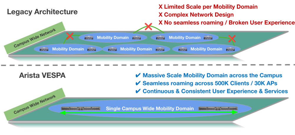 Arista VESPA pakt de kritieke schaalbaarheidslimieten aan waarmee grote organisaties te maken krijgen bij hun exponentiële groei van het aantal clients en IoT-apparaten. Door de consistente, grootschalige technologieën die in datacenters worden gebruikt, toe te passen in campusnetwerken, stelt Arista VESPA klanten in staat om enorme domeinnetwerken voor Wi-Fi-roaming te ontwerpen met meer dan 500.000 clients. Dit garandeert een veerkrachtige sub-second failover architectuur, terwijl de complexiteit in architectuur en hardwareafhankelijkheid van traditionele controllergebaseerde oplossingen worden weggenomen.