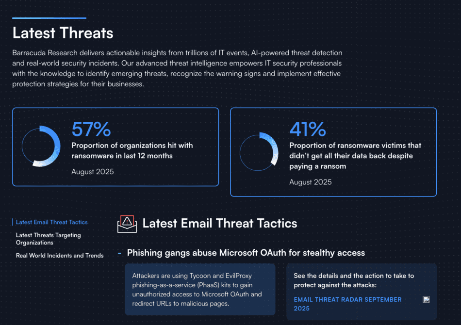 Barra­cuda Networks lanceert Barra­cuda Research: een nieuwe centrale bron voor infor­matie over dreigingen, analyses van incidenten, gegevens over de detectie van e‑maildreigingen door Barra­cuda AI en meer. Barra­cuda Research biedt IT- en securi­ty­pro­fes­si­o­nals – evenals managed service provi­ders – bruik­bare inzichten over de nieuwste dreigingen en geeft aan wat de signalen zijn waar ze op moeten letten. Daarnaast biedt de site prakti­sche stappen om beschermd te blijven. Barra­cuda Research is voor iedereen toegankelijk.