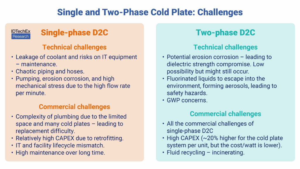 IDTechEx benadrukt dat optimalisatie van ontwerp en materiaalkeuze een deel van de kosten en milieu-impact kan verlagen. Hun analyse omvat een gedetailleerde uitsplitsing van CAPEX voor zowel single- als tweefasige systemen, inclusief componentkosten op koudplaat‑, distributie- en pomptechnologieniveau. Naarmate meer leveranciers schaalvoordelen behalen en nieuwe, milieuvriendelijkere koelmiddelen op de markt komen, kan de adoptie versnellen.