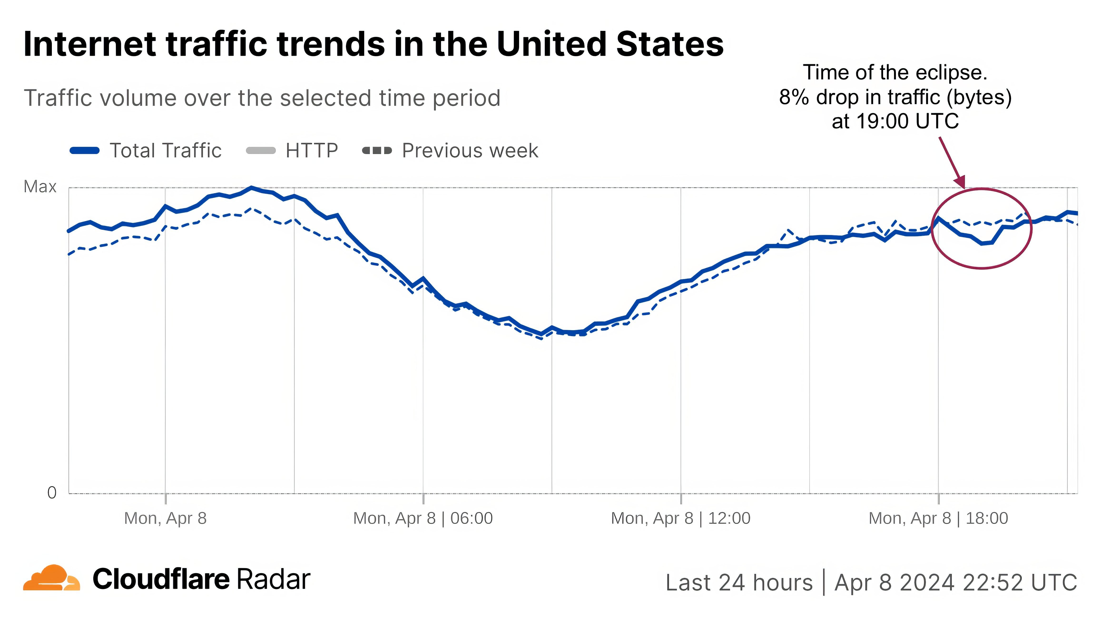 We zijn inmiddels wel gewend aan flinke pieken in het internetverkeer als zich nergens op de wereld een belangrijke gebeurtenis voordoet. Het EK voetbal, de Olympische Spelen in Parijs – ze zullen ongetwijfeld weer tot nieuwe records aan internetverkeer leiden. Interessant genoeg was er tijdens de totale zonsverduistering die op 8 april 2024 door Noord-Amerika trok een tegenovergestelde trend te zien: er was juist sprake van een duidelijke daling in het internetverkeer, zo schrijft João Tomé van Cloudflare in een blog waarin hij de impact van de zonsverduistering op het internetverkeer analyseert.